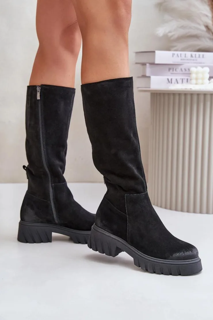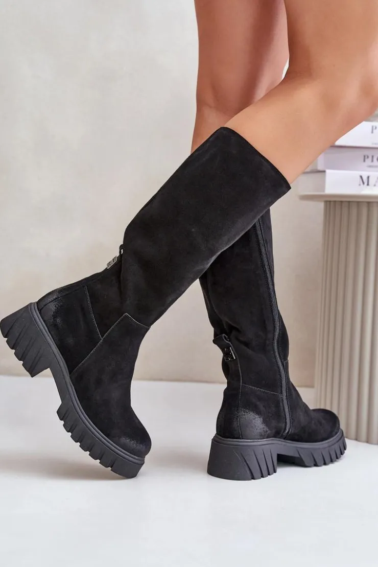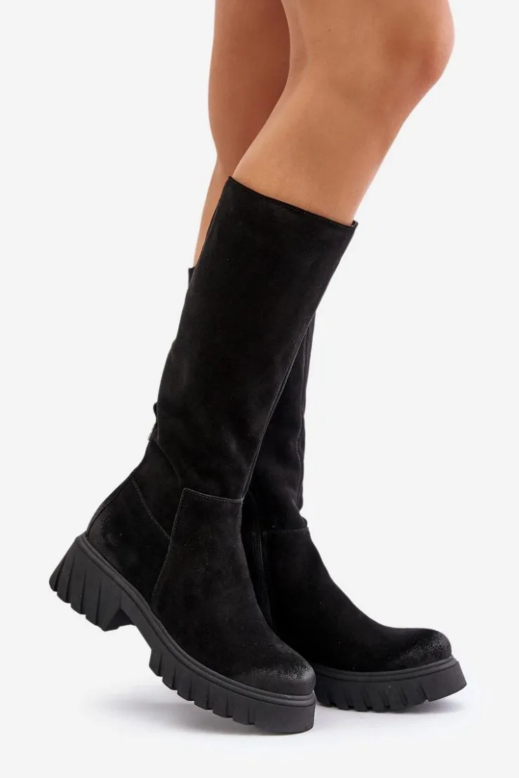 Stylowe damskie kozaki są wykonane z najwyższej jakości naturalnej skóry zamszowej. Ten model charakteryzuje się bocznym suwakiem na cholewce. Kozaki mają noski zaokrąglone i są osadzone na platformie i płaskim obcasie. Wnętrze jest ocieplane filcem, co zapewnia dodatkowy komfort termiczny. Te kozaki to niezbędny element każdej garderoby! Przy wyborze rozmiaru prosimy kierować tabelą rozmiarów.