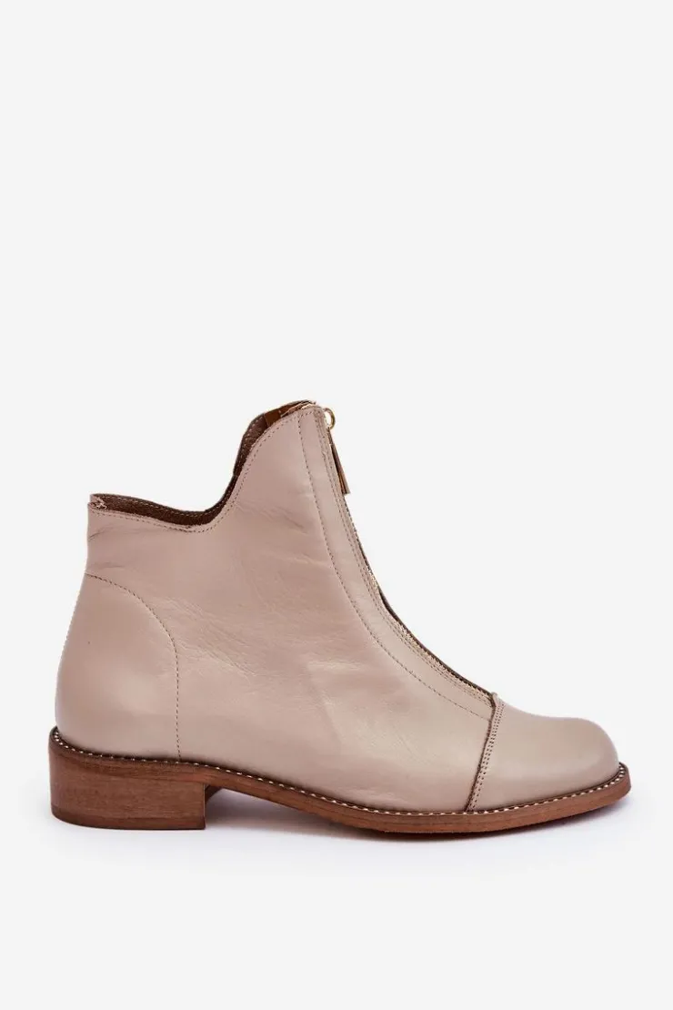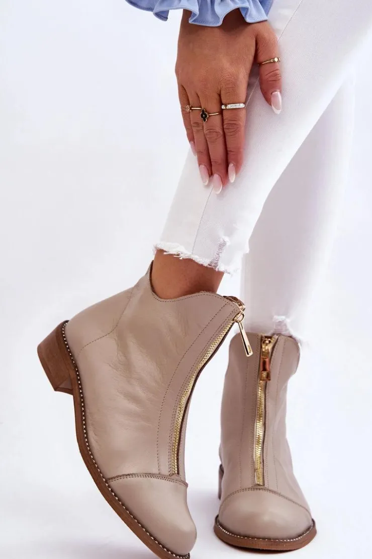 Modne botki damskie zostały wykonane z wysokiej jakości skóry naturalnej. Posiadają suwak na przodzie cholewki. Buty zostały osadzone na płaskim obcasie. Dodatkowo posiadają usztywniany zapiętek. Miękka, skórzana wkładka zapewni Ci wysoki komfort użytkowania przez cały dzień! Koniecznie powinnaś je mieć! Przy wyborze rozmiaru prosimy sugerować się tabelą rozmiarów.