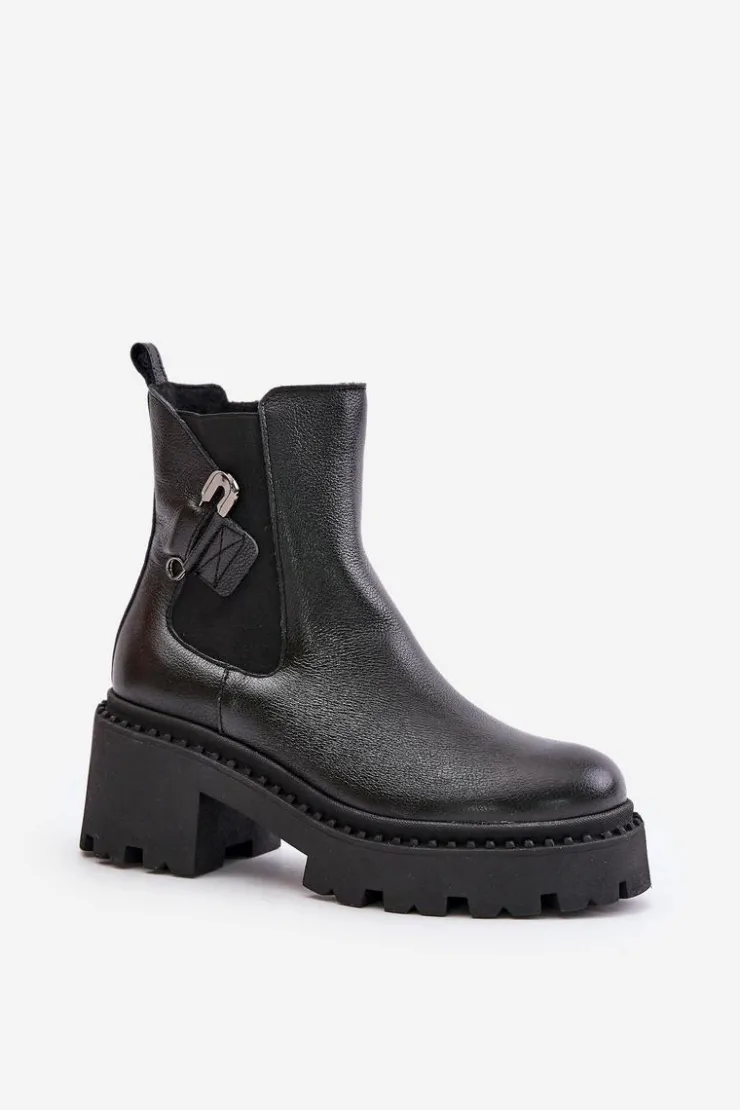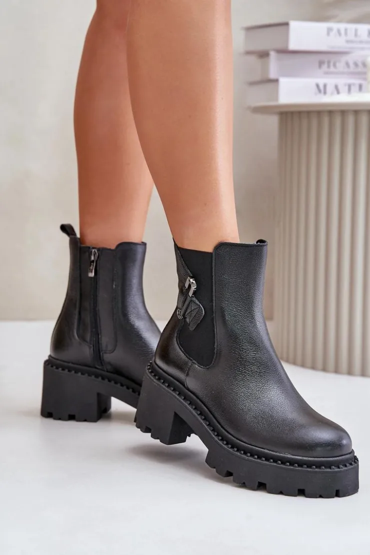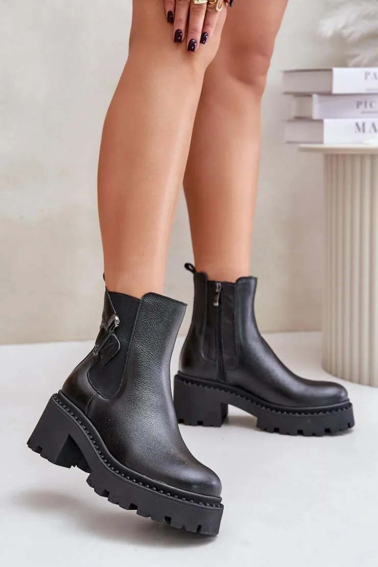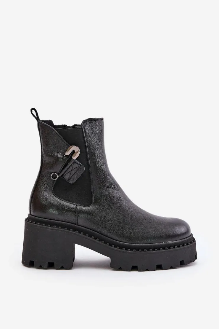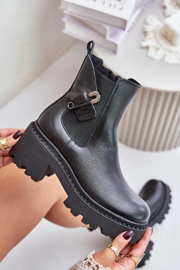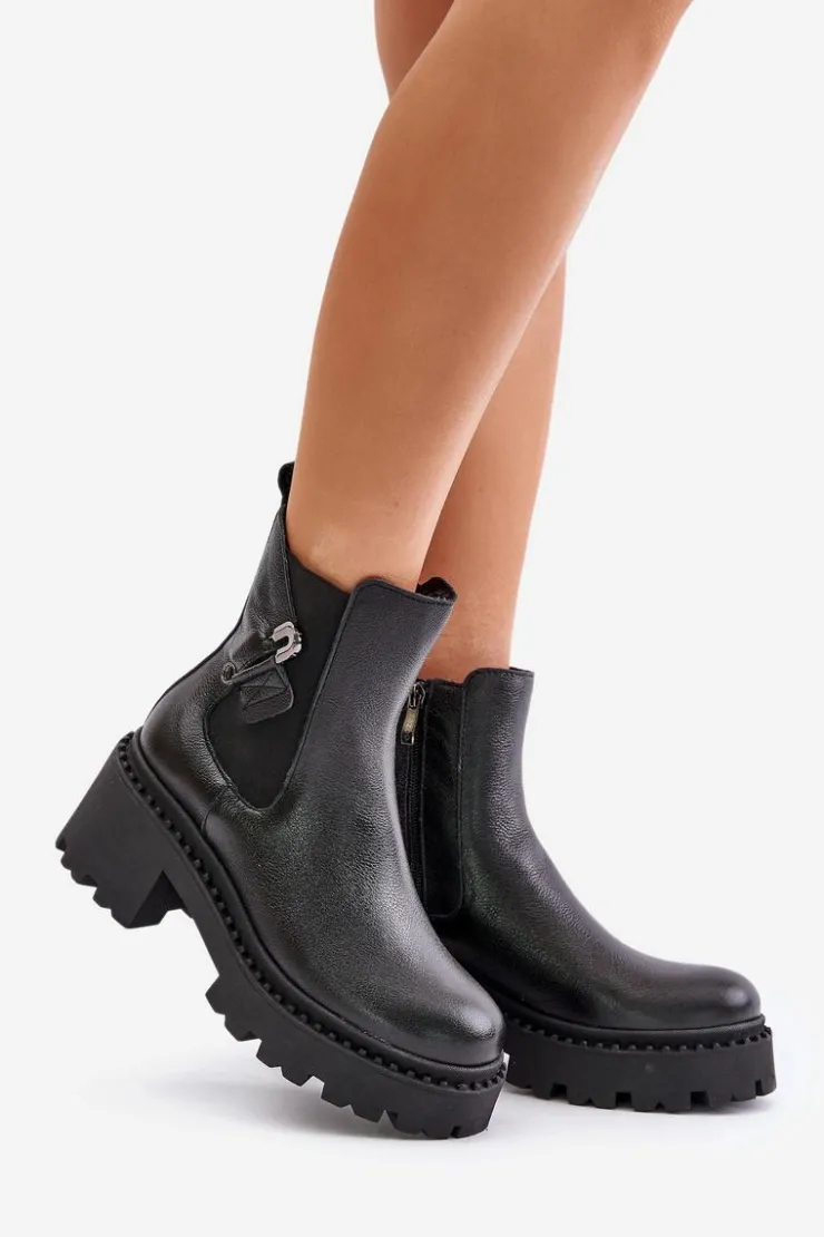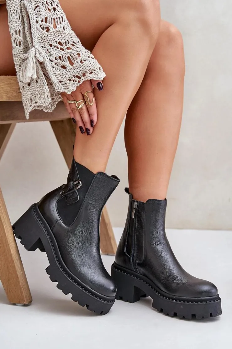 Botki wykonane z wysokiej jakości skóry naturalnej. Zapinane na zamek. Ocieplane filcem, co zapewnia komfort w chłodne dni. Model posiada zaokrąglone noski i osadzony jest na masywnym obcasie, co dodaje stabilności. Głównym atutem jest ozdoba w postaci agrafki. Przy wyborze rozmiaru prosimy kierować się tabelą rozmiarów