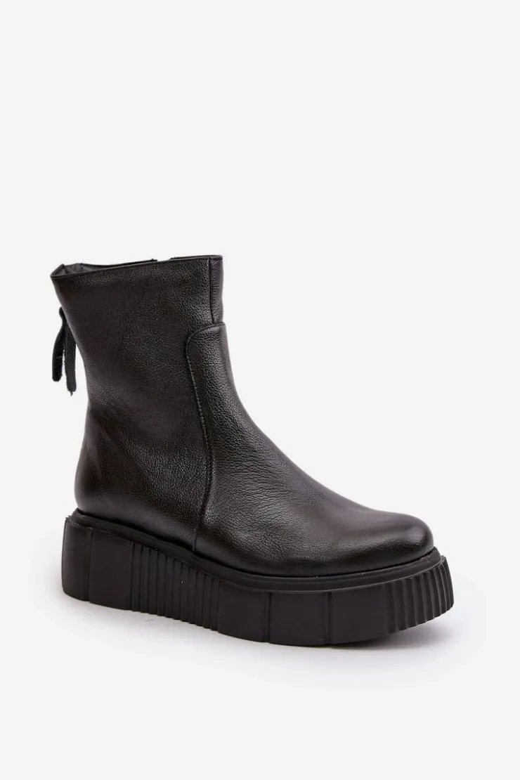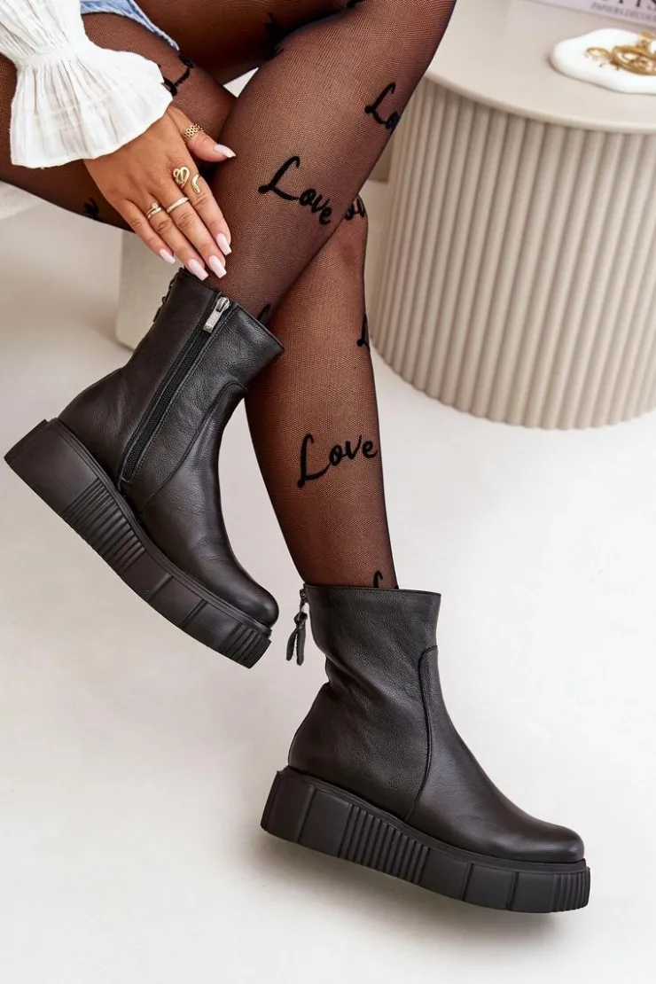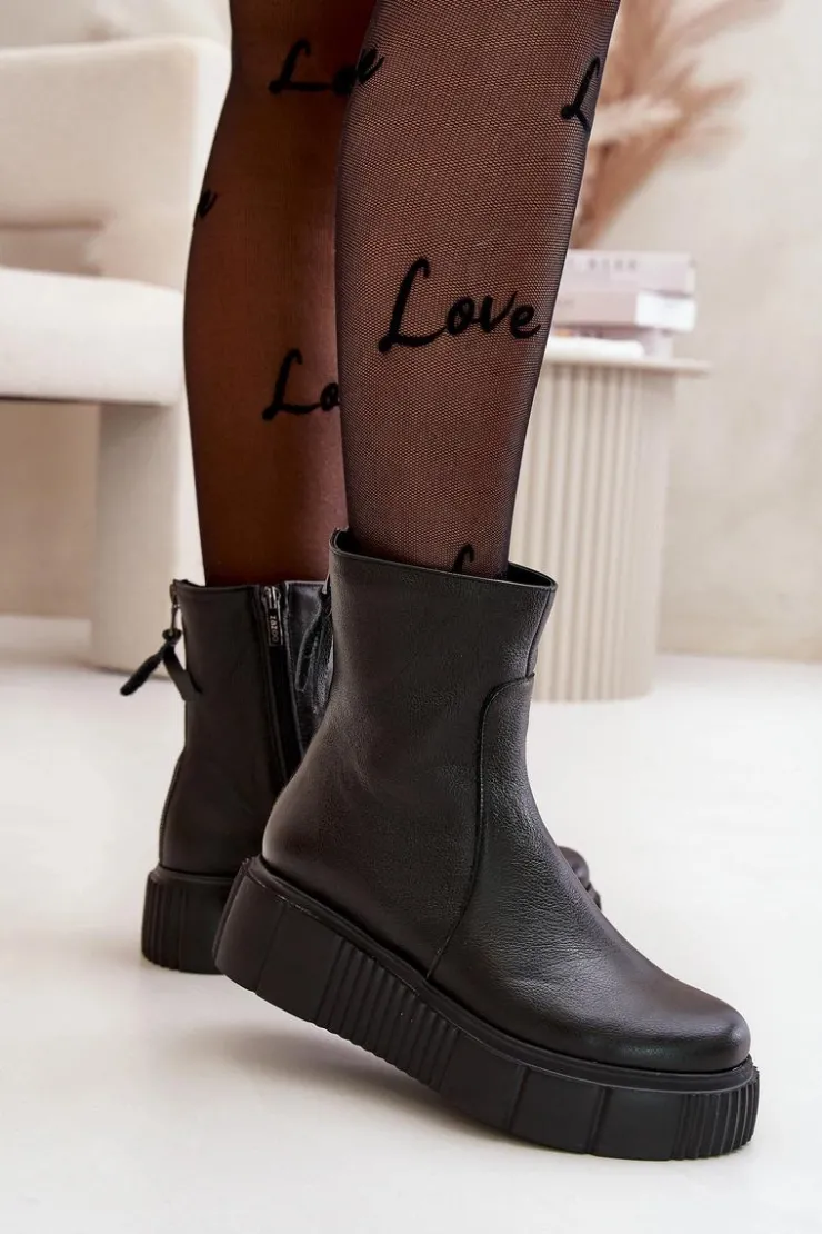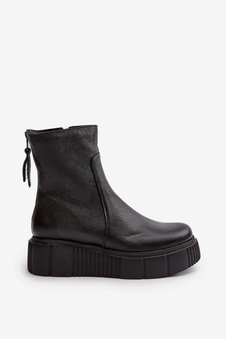 Botki damskie zostały wykonane z wysokiej jakości naturalnych skór. Osadzone na masywnej platformie z delikatnym koturnem. Zapinane z boku cholewki na suwak, natomiast suwak z tyłu jest ozdobny. Dodatkowo botki posiadają usztywniany zapiętek. Ocieplone w środku filcem. Model ten na pewno sprawdzi się w wielu jesiennych stylizacjach! Przy wyborze rozmiaru prosimy kierować się tabelą rozmiarów