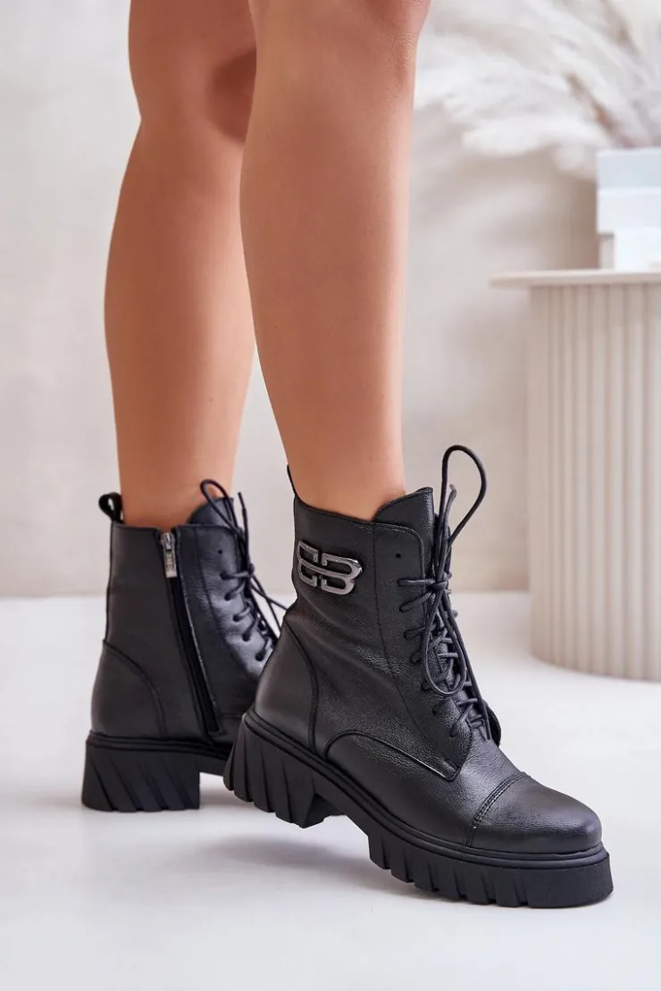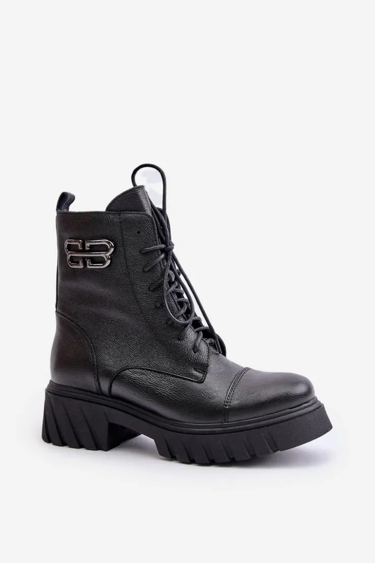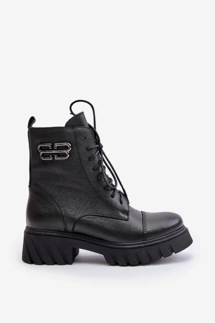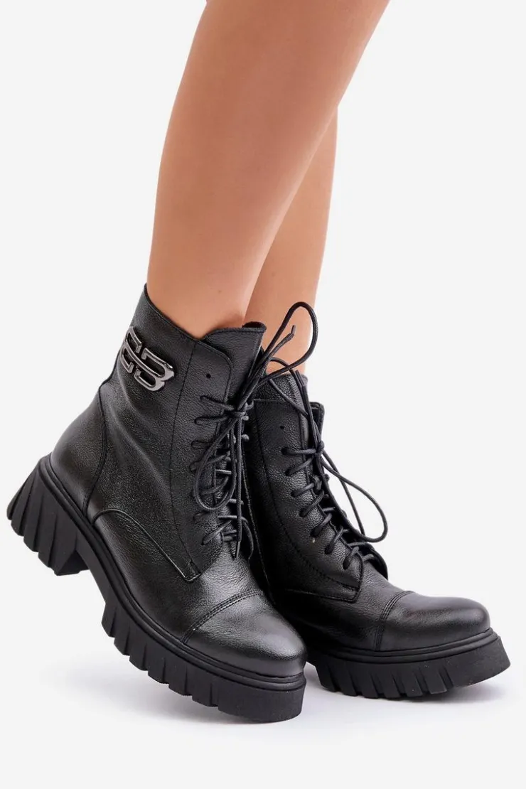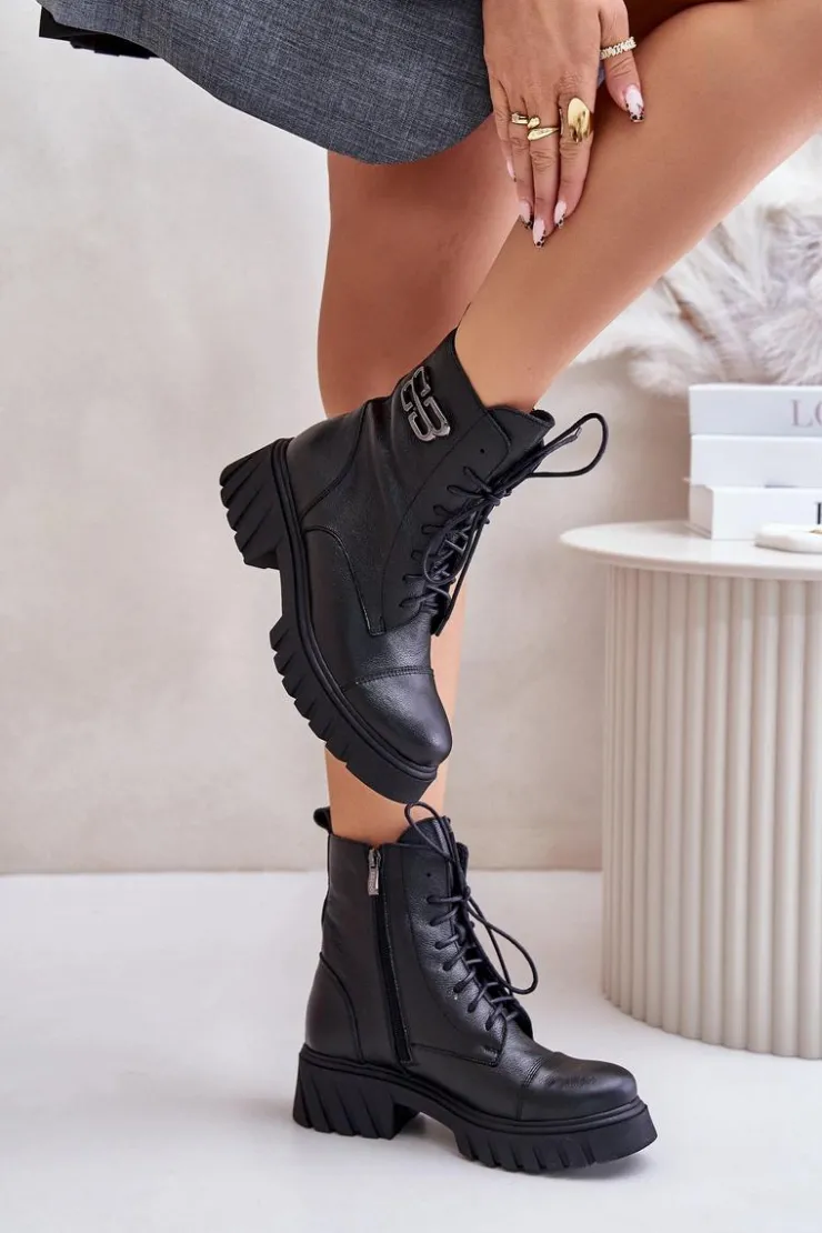 Botki damskie wykonane ze skóry naturalnej. Osadzone na masywnym, płaskim obcasie i platformie. Posiadają zarówno sznurowanie, jak i zamek, co zapewnia wygodę zakładania i dopasowanie do stopy. Z boku cholewki ozdobny, złoty detal, który dodaje elegancji. Wnętrze ocieplone kocem obuwniczym. Idealne do jesiennych i zimowych stylizacji, te botki łączą elegancję z funkcjonalnością. Przy wyborze rozmiaru prosimy kierować się tabelą rozmiarów