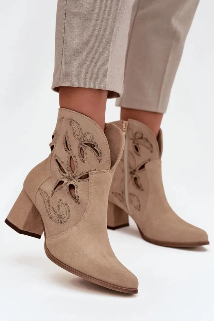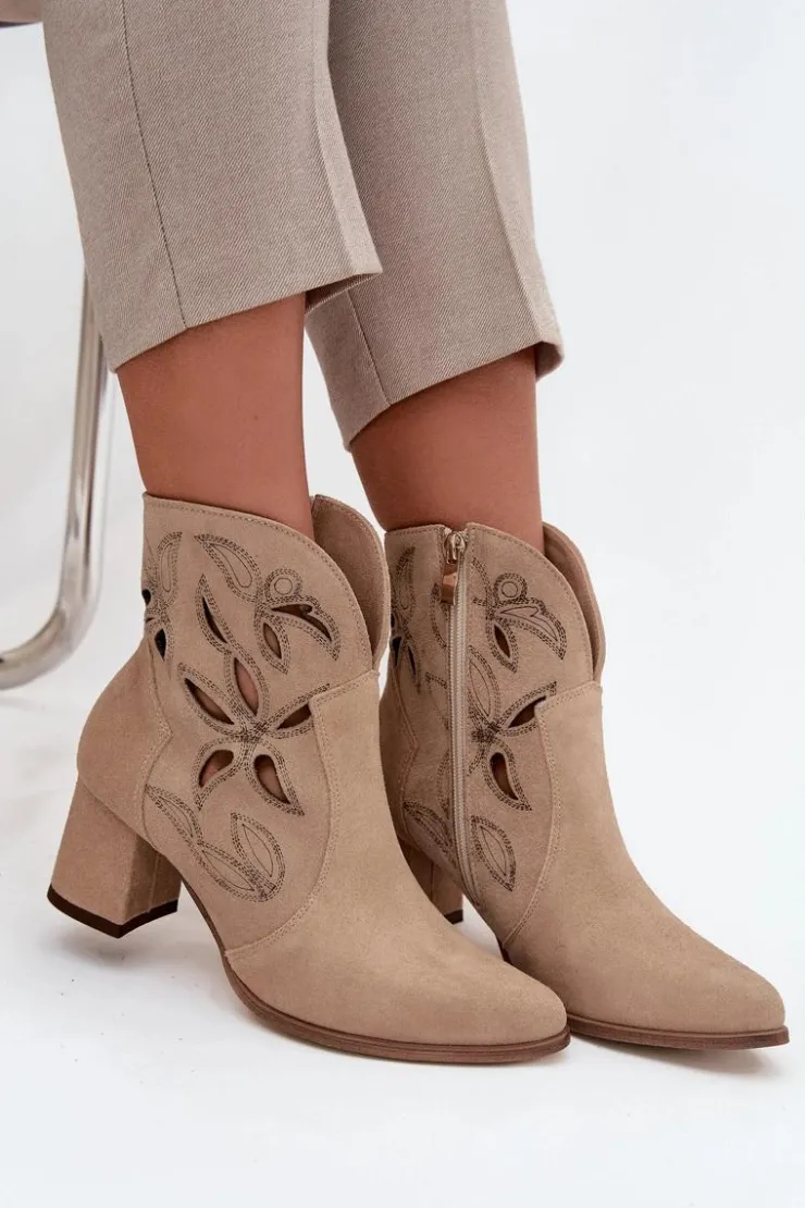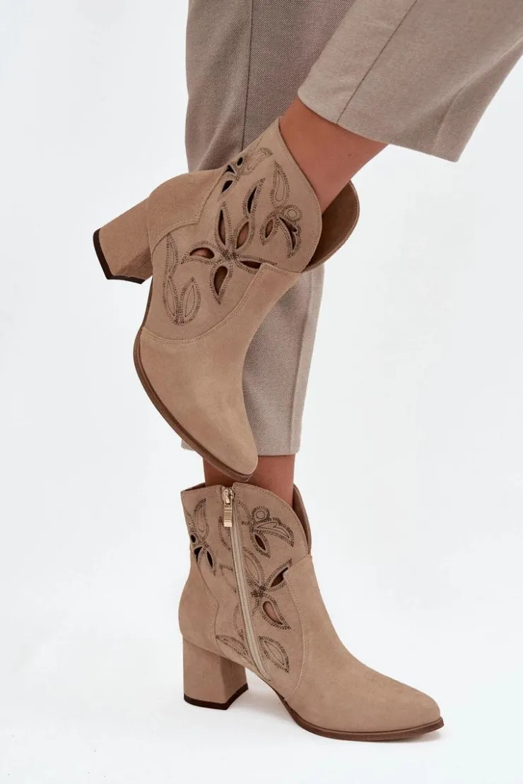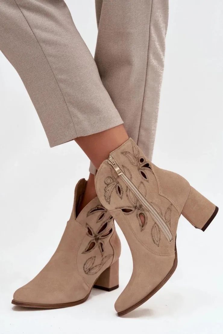 Botki damskie wykonane z naturalnego zamszu. Ażurowy wzór dodaje im oryginalności i lekkości, podkreślając wyjątkowy charakter tego modelu. Obcas typu słupek zapewnia stabilność i wygodę, a jednocześnie pięknie wydłuża sylwetkę. Szpiczaste noski wprowadzają elegancki akcent, sprawiając, że buty prezentują się niezwykle zgrabnie. Dzięki zapięciu na zamek są łatwe w zakładaniu i zdejmowaniu, co zwiększa komfort codziennego użytkowania. To obuwie idealne na sezon przejściowy, które świetnie uzupełni zarówno casualowe, jak i bardziej eleganckie zestawy. Przy wyborze rozmiaru prosimy sugerować się tabelą rozmiarów.
