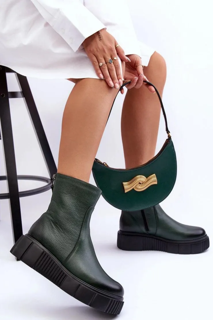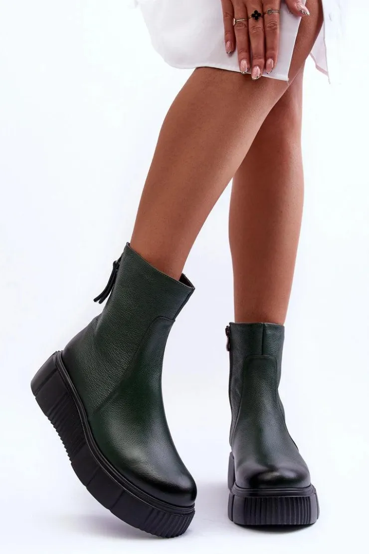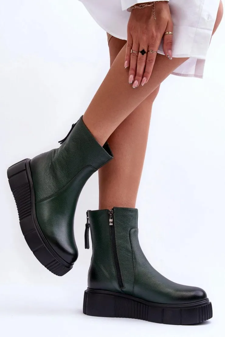 Botki damskie zostały wykonane z wysokiej jakości naturalnych skór. Osadzone na masywnej platformie z delikatnym koturnem. Zapinane z boku cholewki na suwak, natomiast suwak z tyłu jest ozdobny. Dodatkowo botki posiadają usztywniany zapiętek. Ocieplone w środku kocem obuwniczym. Model ten na pewno sprawdzi się w wielu jesiennych stylizacjach! Przy wyborze rozmiaru prosimy kierować się tabelą rozmiarów