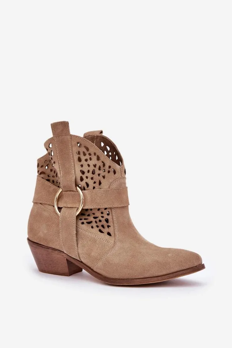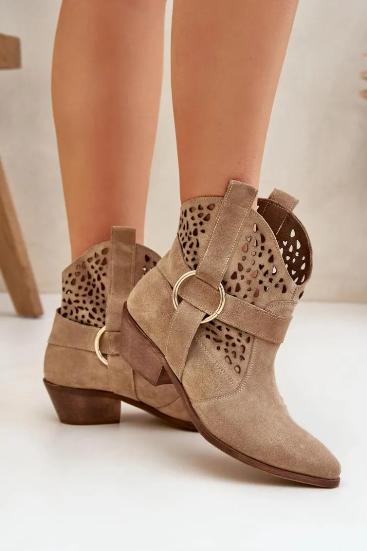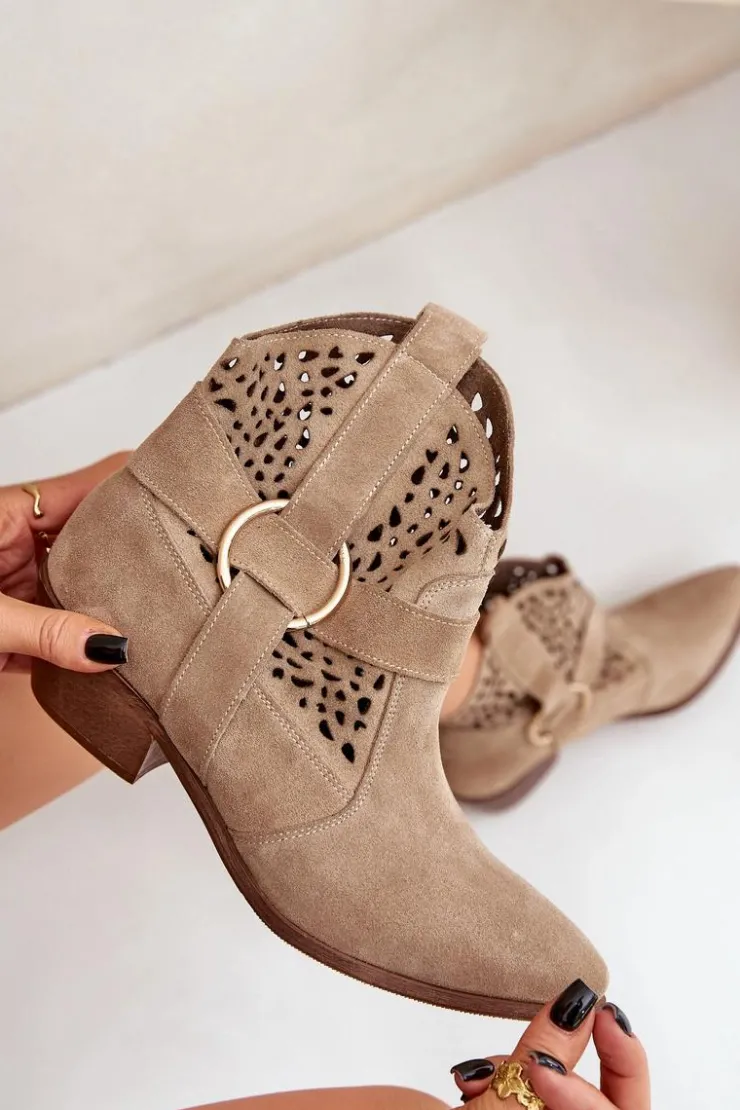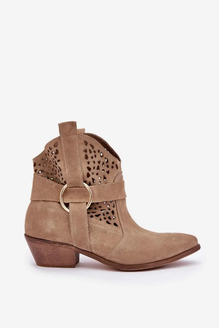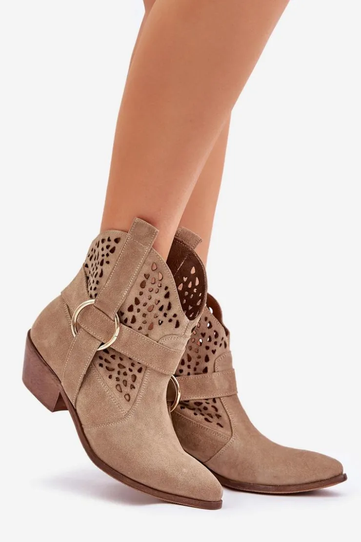 Stylowe i eleganckie botki damskie wykonane z naturalnego zamszu, które doskonale łączą modny wygląd z wygodą użytkowania. Model osadzony na niskim obcasie, idealny na co dzień i do bardziej formalnych stylizacji. Ażurowa cholewka ozdobiona delikatnym akcentem nadaje im wyjątkowego charakteru. Szpiczaste noski optycznie wysmuklają stopę, dodając szyku każdemu zestawowi. To doskonały wybór dla kobiet ceniących jakość, styl i komfort. Przy wyborze rozmiaru prosimy sugerować się tabelą rozmiarów.