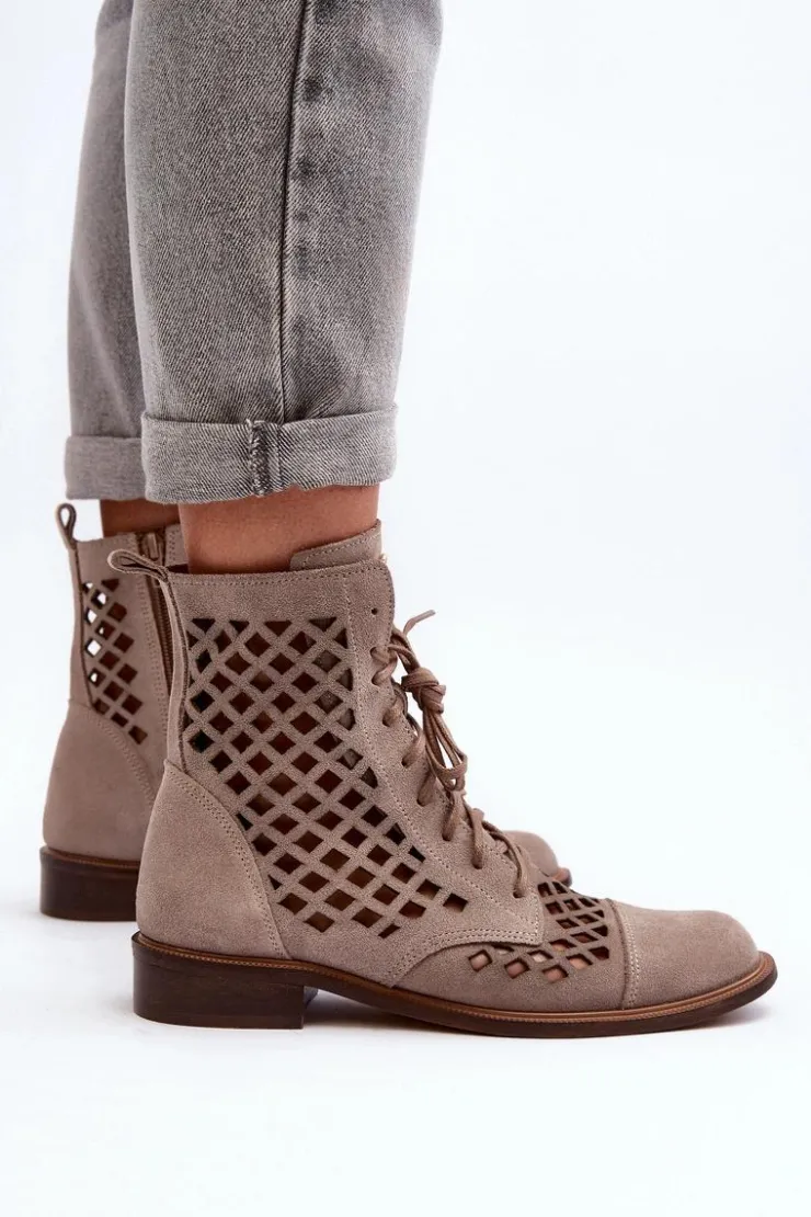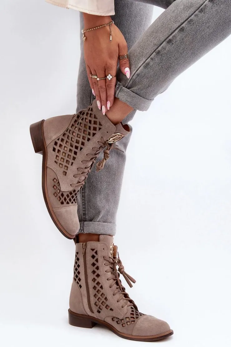 Wyjątkowe, ażurowe botki damskie. Wykonane są w całości ze skóry naturalnej z dbałością o każdy detal. Skórzana wkładka oraz wygodny, płaski obcas zadbają o Twój komfort. Botki dopełnią wiele stylizacji. Zapinane na suwak oraz wiązane. Przy wyborze rozmiaru prosimy sugerować się tabelą rozmiarów.