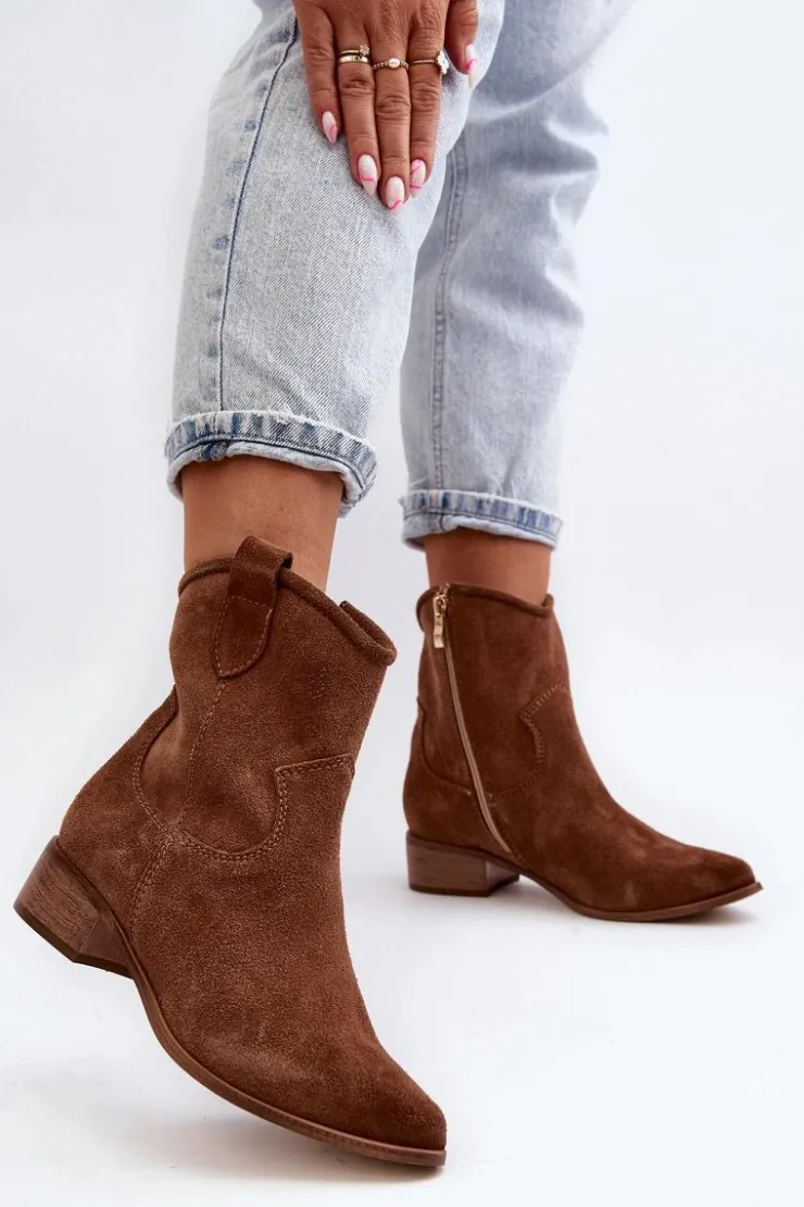 Zazoo Botki Wiosenne|Botki Skórzane*3329 Zamszowe Botki Kowbojki Na Niskim Obcasie Brązowe