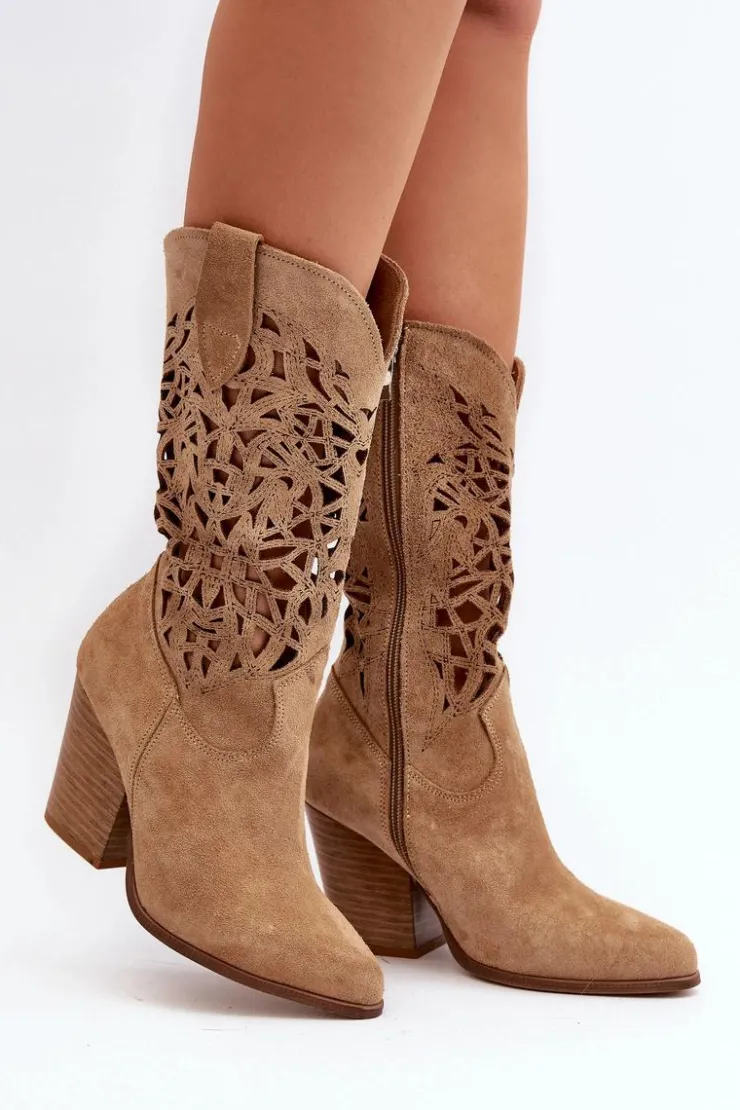 Damskie botki wykonane z naturalnego zamszu. Osadzone na obcasie w postaci słupka. Ażurowy wzorek na cholewce. Zapinane na zamek błyskawiczny. Miękka, niezwykle wygodna wkładka zapewni komfort podczas użytkowania. Noski w szpic optycznie wysmuklą nogi. Koniecznie powinnaś je mieć! Przy wyborze rozmiaru prosimy sugerować się tabelą rozmiarów.