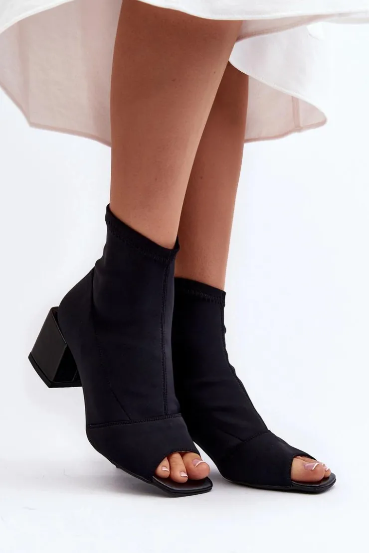 Botki damskie wykonane z materiału tekstylnego. Osadzone na obcasie w postaci klocka. Cholewka za kostkę wzbogacona przeszyciami. Model wsuwany. Wkładka ze skóry naturalnej zapewni komfort podczas użytkowania. Noski odkryte. Ten niezwykle stylowy model wykorzystasz do wielu wiosennych stylizacji! Przy wyborze rozmiaru prosimy kierować się tabelą rozmiarów