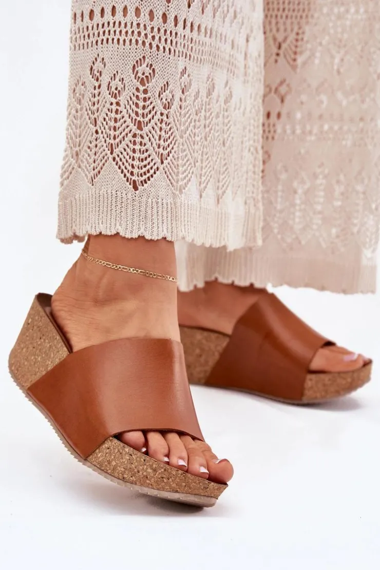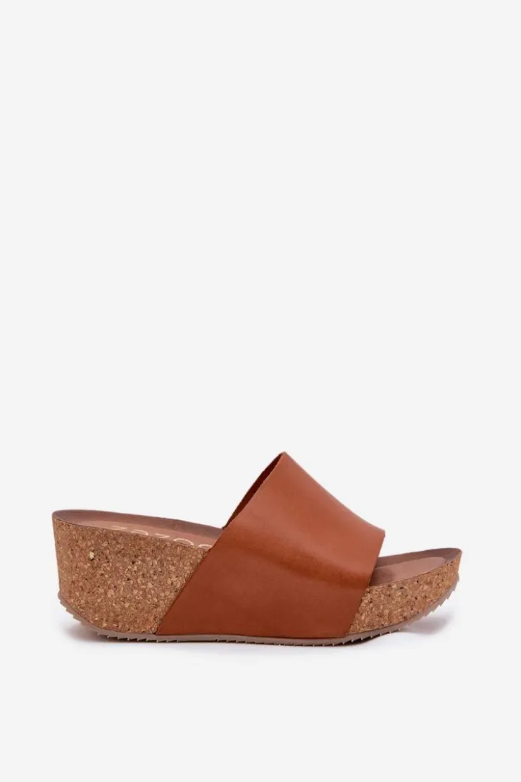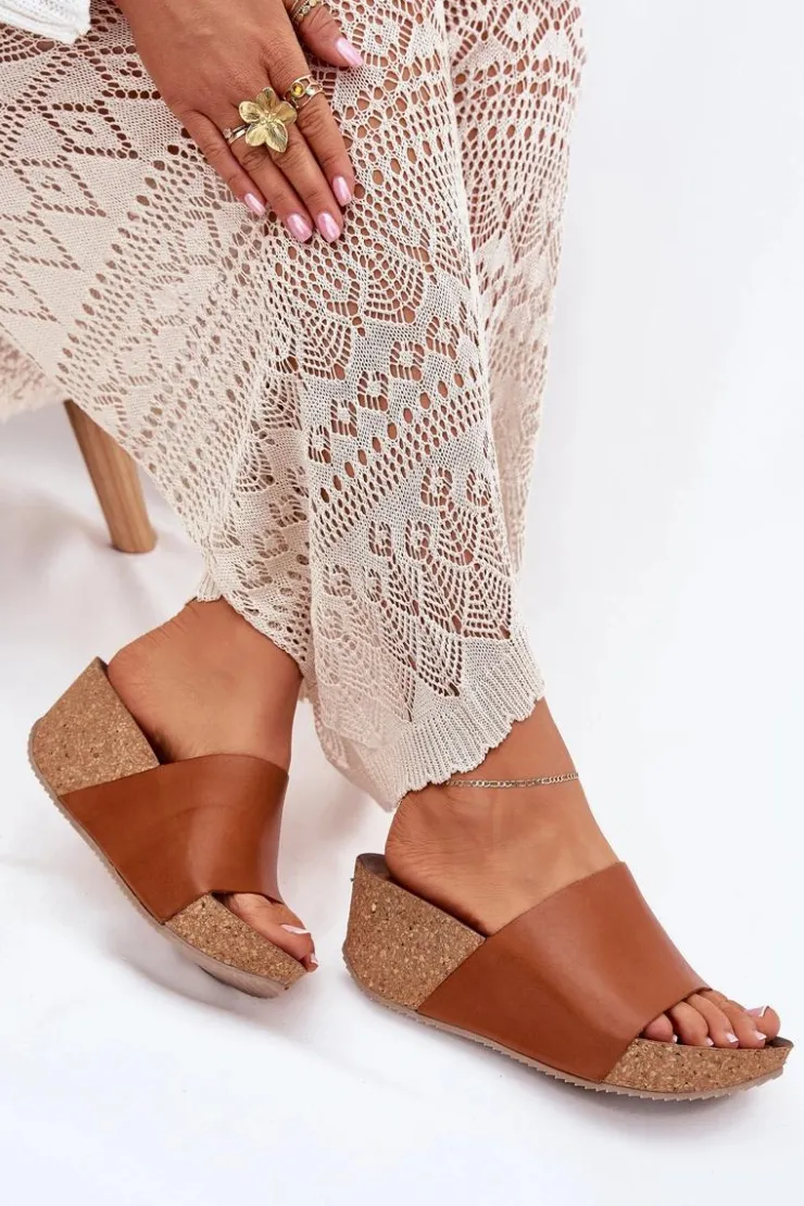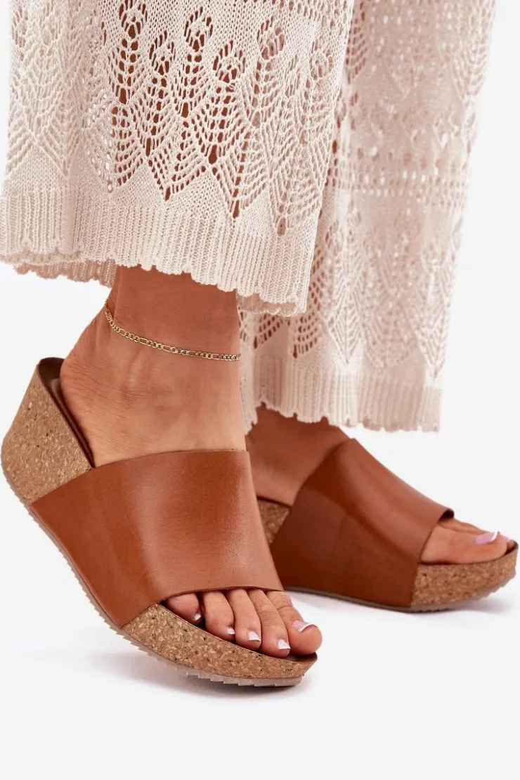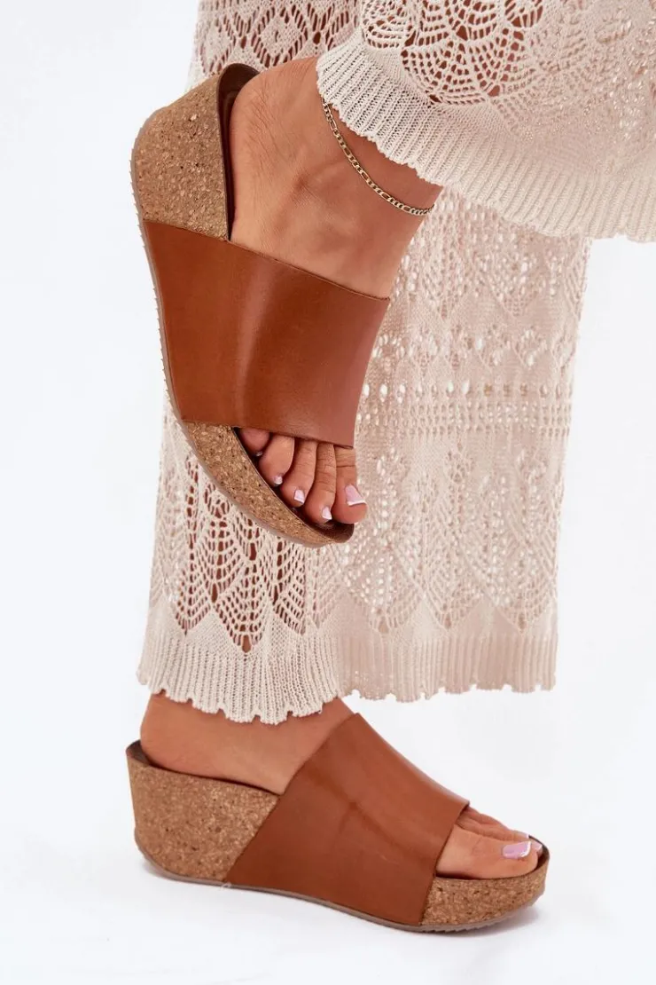 Klapki damskie na korkowym koturnie. Wykonane z wysokiej jakości skóry naturalnej, zapewniają trwałość i komfort noszenia. Modny fason, który będzie idealnym wyborem na letnie dni. Przy wyborze rozmiaru prosimy sugerować się tabelą rozmiarów.