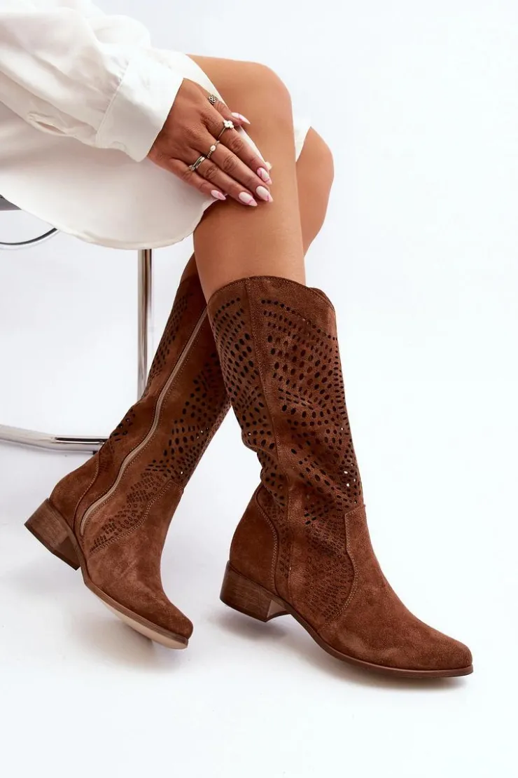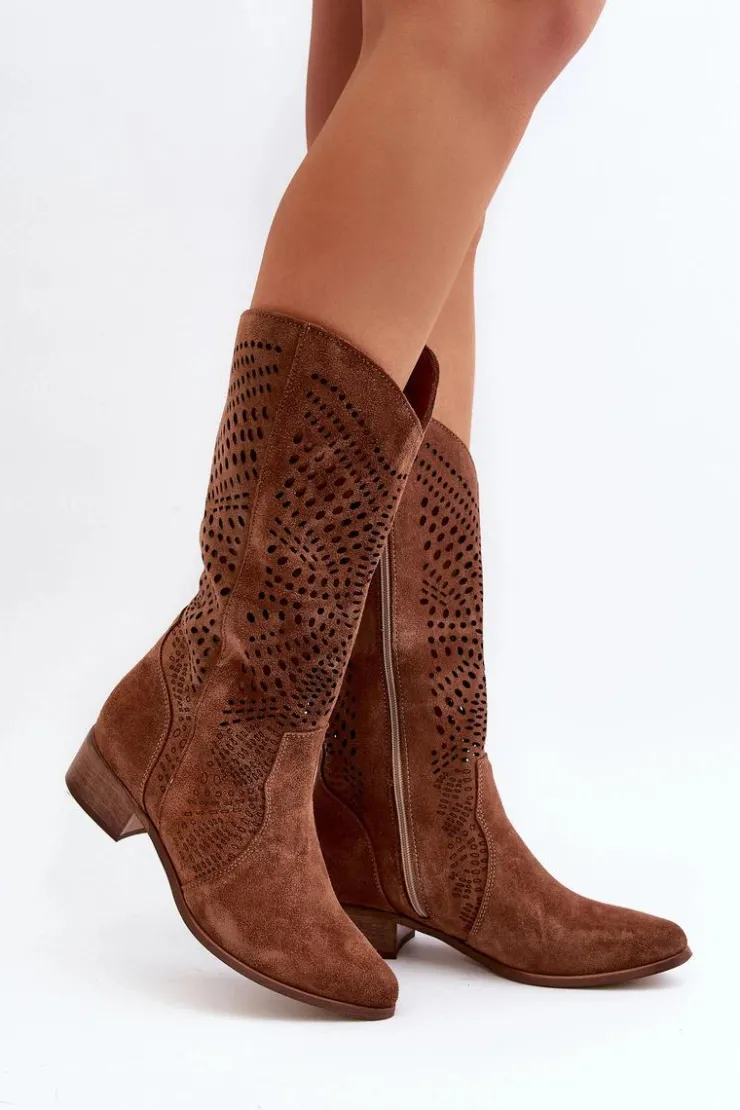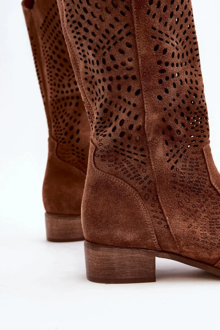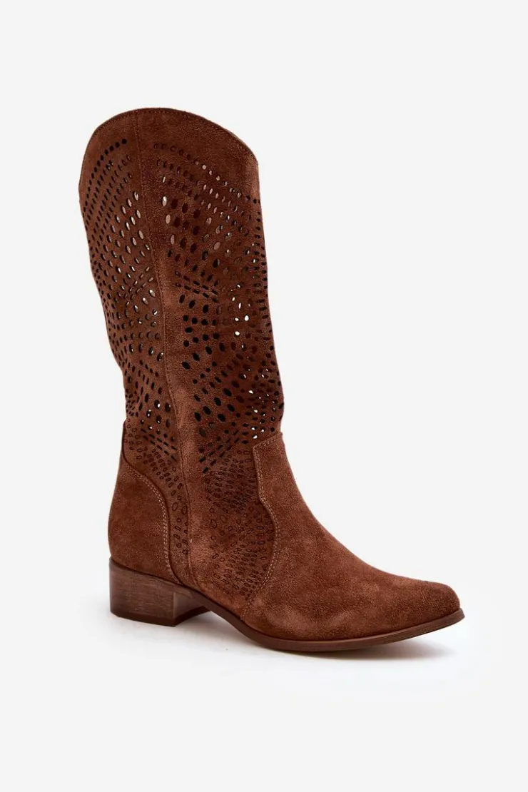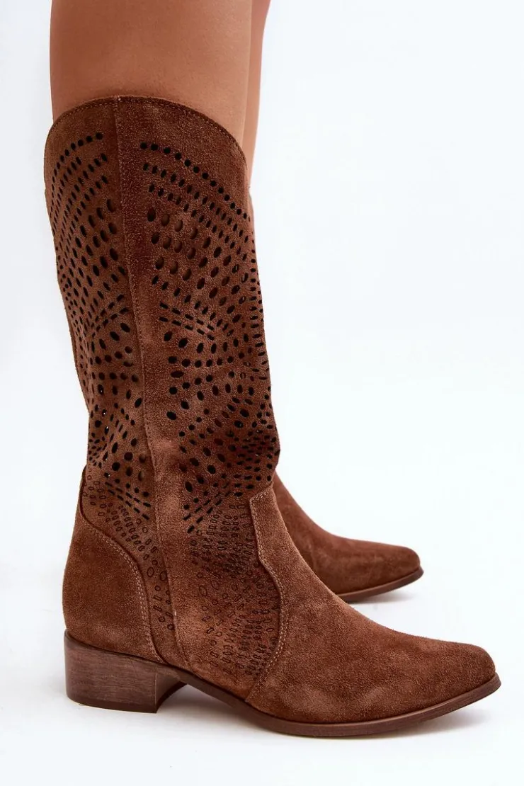 Kozaki-kowbojki zostały wykonane z naturalnego zamszu. Posiadają ażurowy wzorek na cholewce. Model ten zapinany jest na suwak z boku cholewki. Miękka, skórzana wkładka pozwoli na komfortowe użytkowanie obuwia. Dodatkowo kozaki posiadają usztywniany zapiętek. Przy wyborze rozmiaru prosimy sugerować się tabelą rozmiarów.