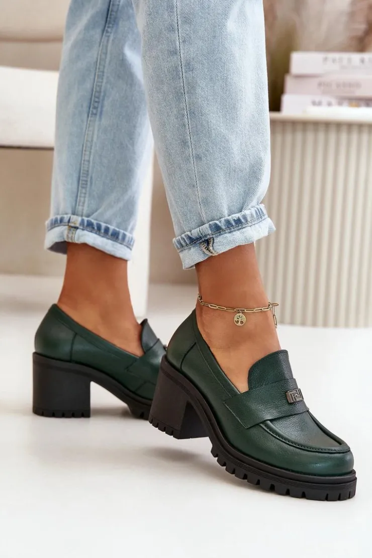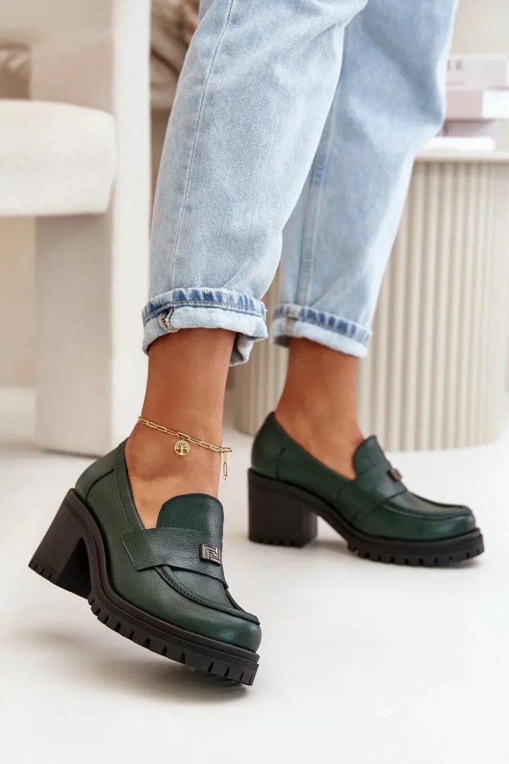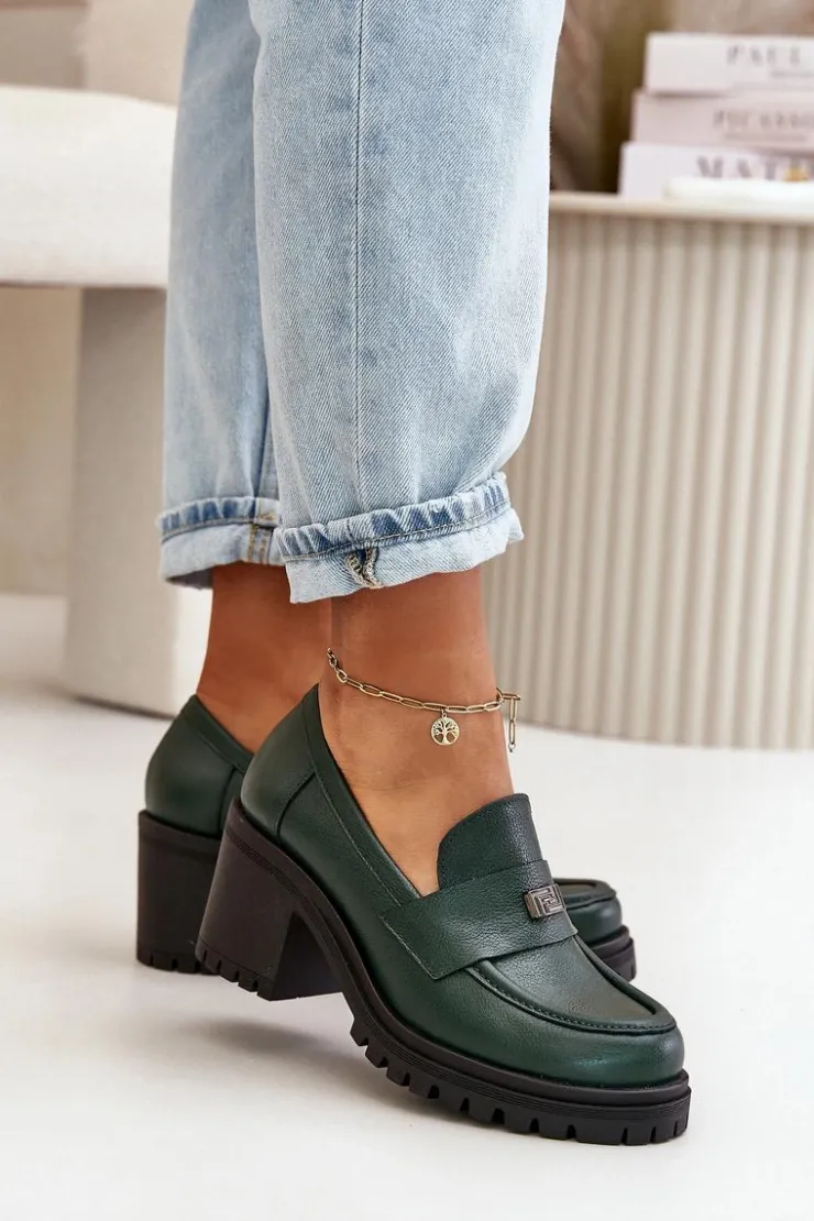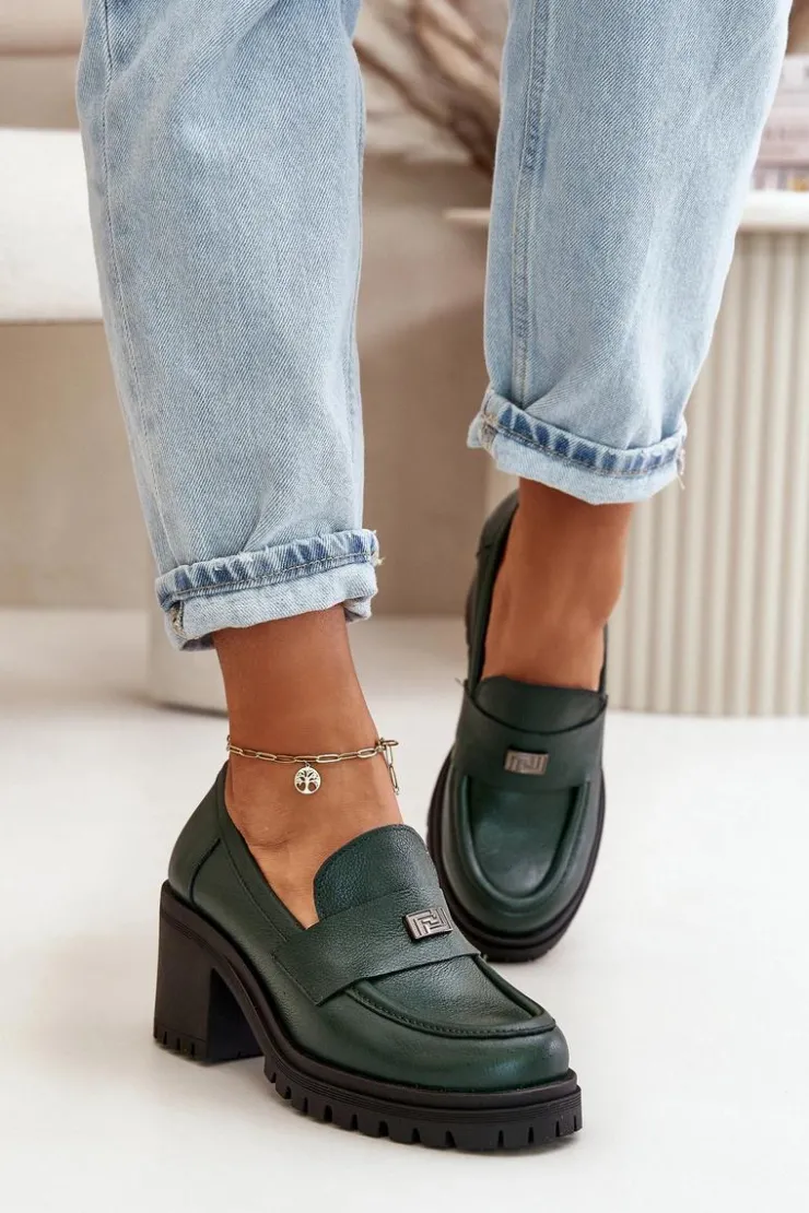 Zazoo Półbuty Skórzane*20168 Eleganckie Półbuty Damskie Na Słupku Skóra Naturalna Ciemnozielone Zielony