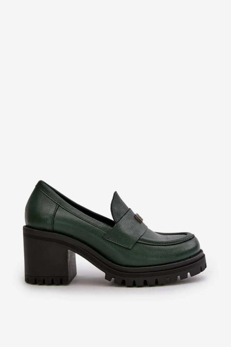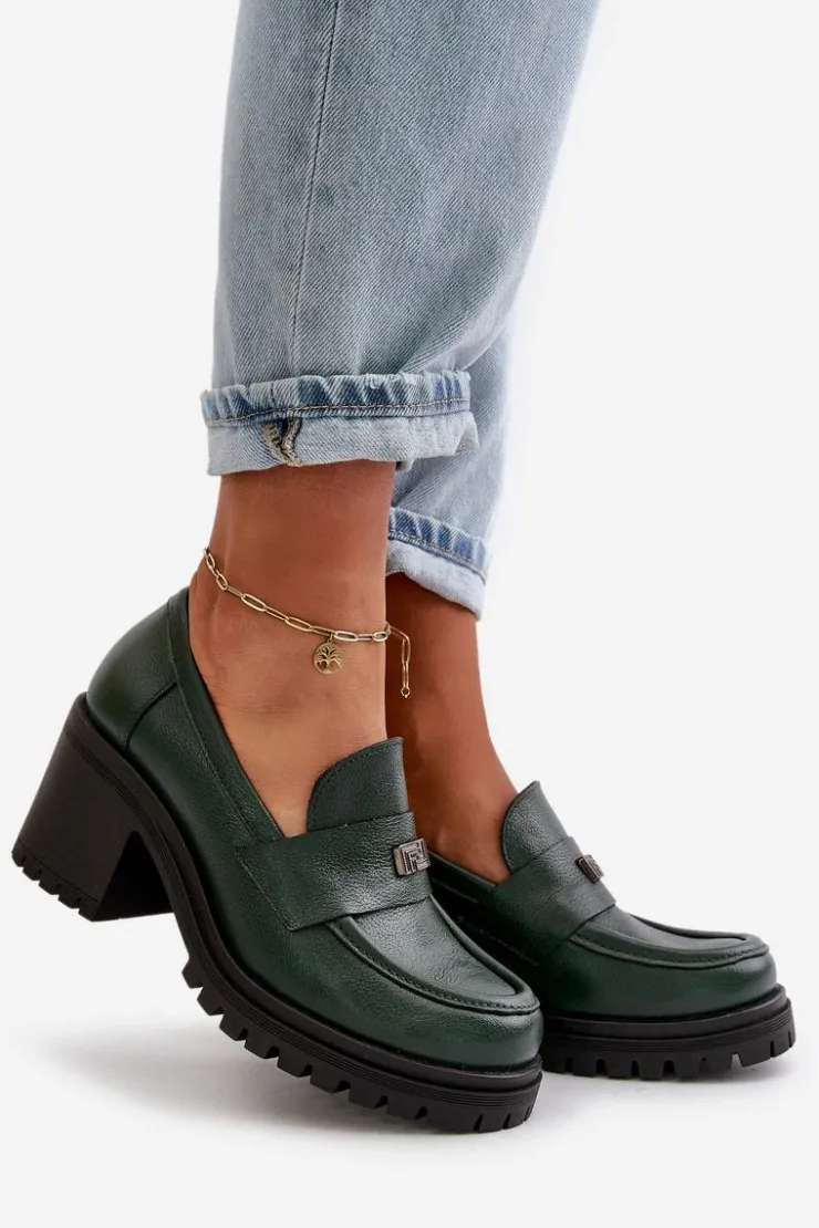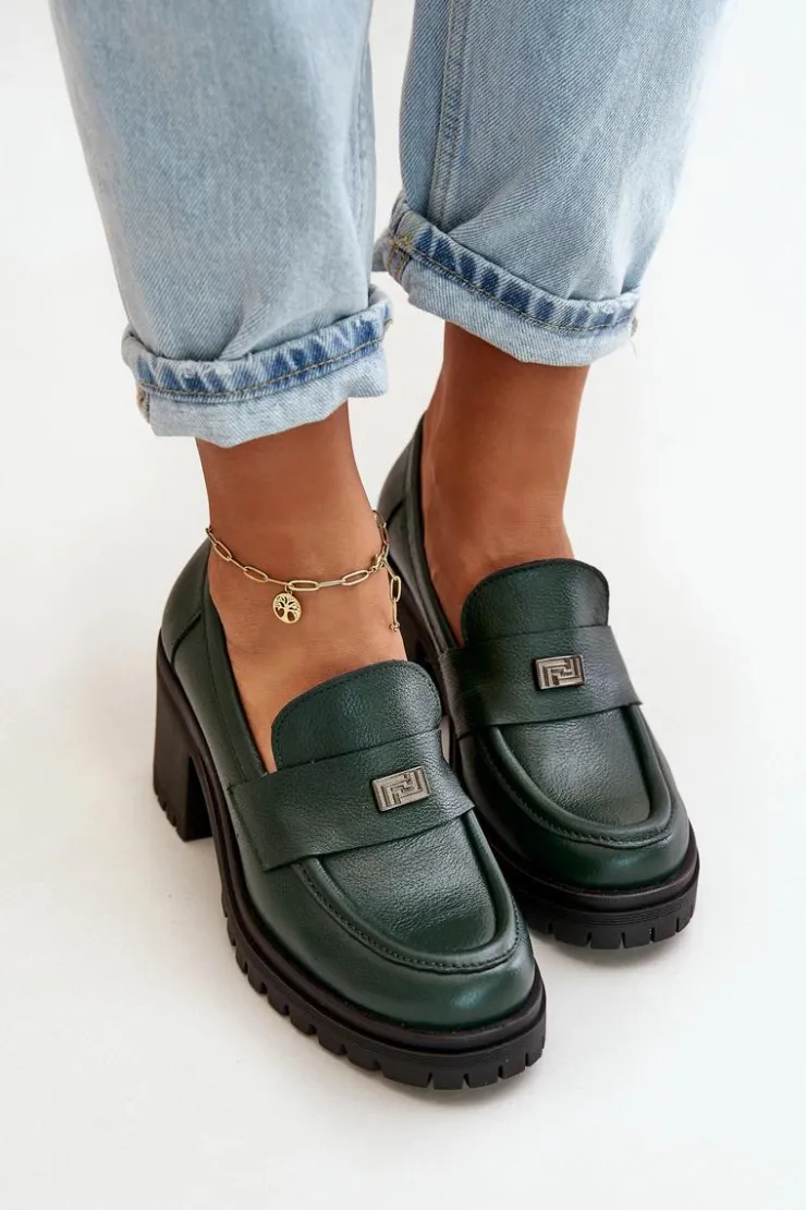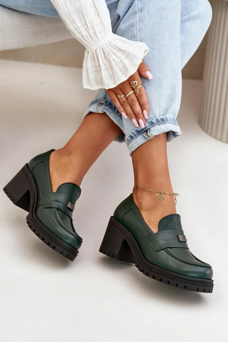 Zazoo Półbuty Skórzane*20168 Eleganckie Półbuty Damskie Na Słupku Skóra Naturalna Ciemnozielone Zielony