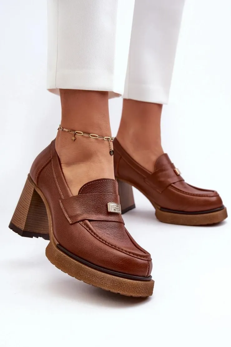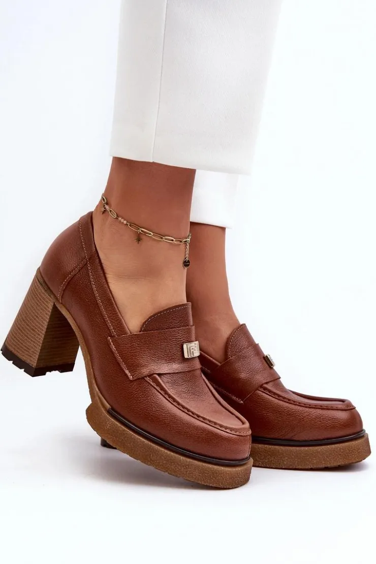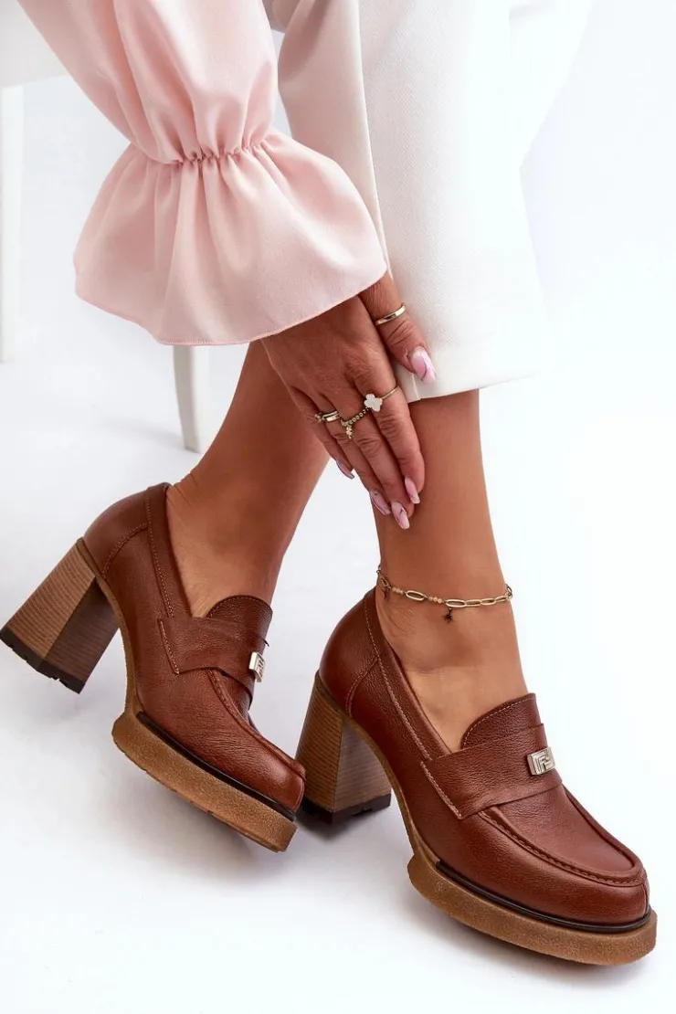 Damskie półbuty na obcasie w postaci słupka z delikatną platformą. Wykonane ze skóry naturalnej. Model ten posiada zaokrąglone noski. Podeszwa wykonana z gumowego tworzywa. Usztywniony zapiętek dodatkowo stabilizuje stopę. Na przodzie pasek z małą ozdobą. Idealne do wiosennych stylizacji! Koniecznie powinnaś je mieć! Przy wyborze rozmiaru prosimy sugerować się tabelą rozmiarów.