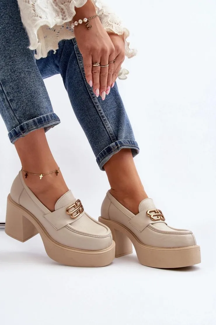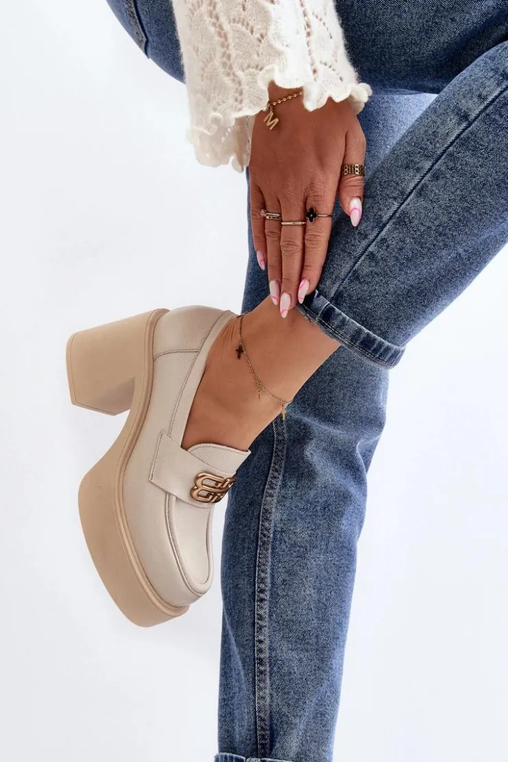 Damskie półbuty na obcasie z cholewką wykonaną ze skóry naturalnej. Osadzone na grubej podeszwie oraz obcasie w postaci masywnego słupka. Model ten posiada zaokrąglone noski. Skórzana wkładka zapewni wygodę podczas użytkowania. Z przodu pasek oraz ozdoba. Przy wyborze rozmiaru prosimy sugerować się tabelą rozmiarów.