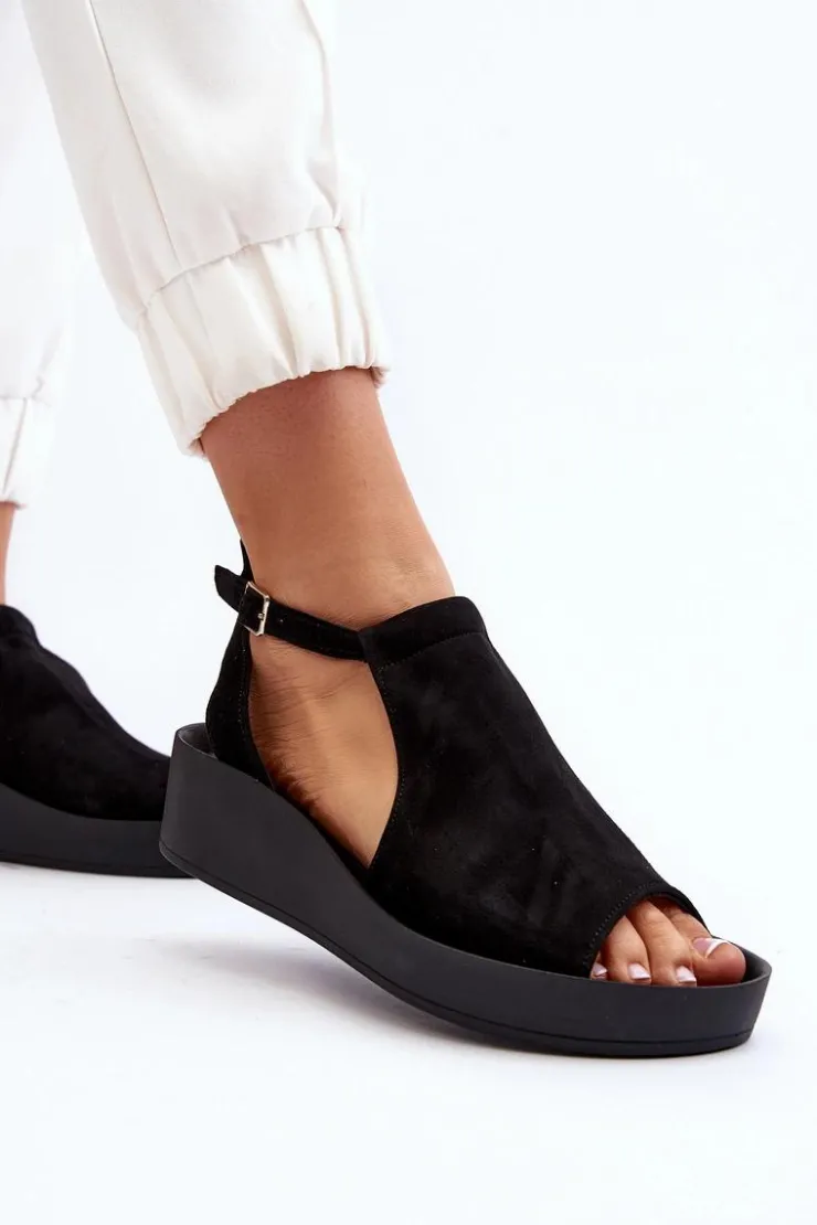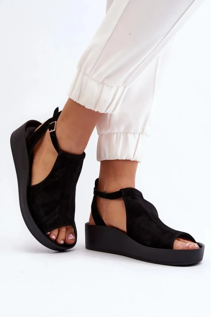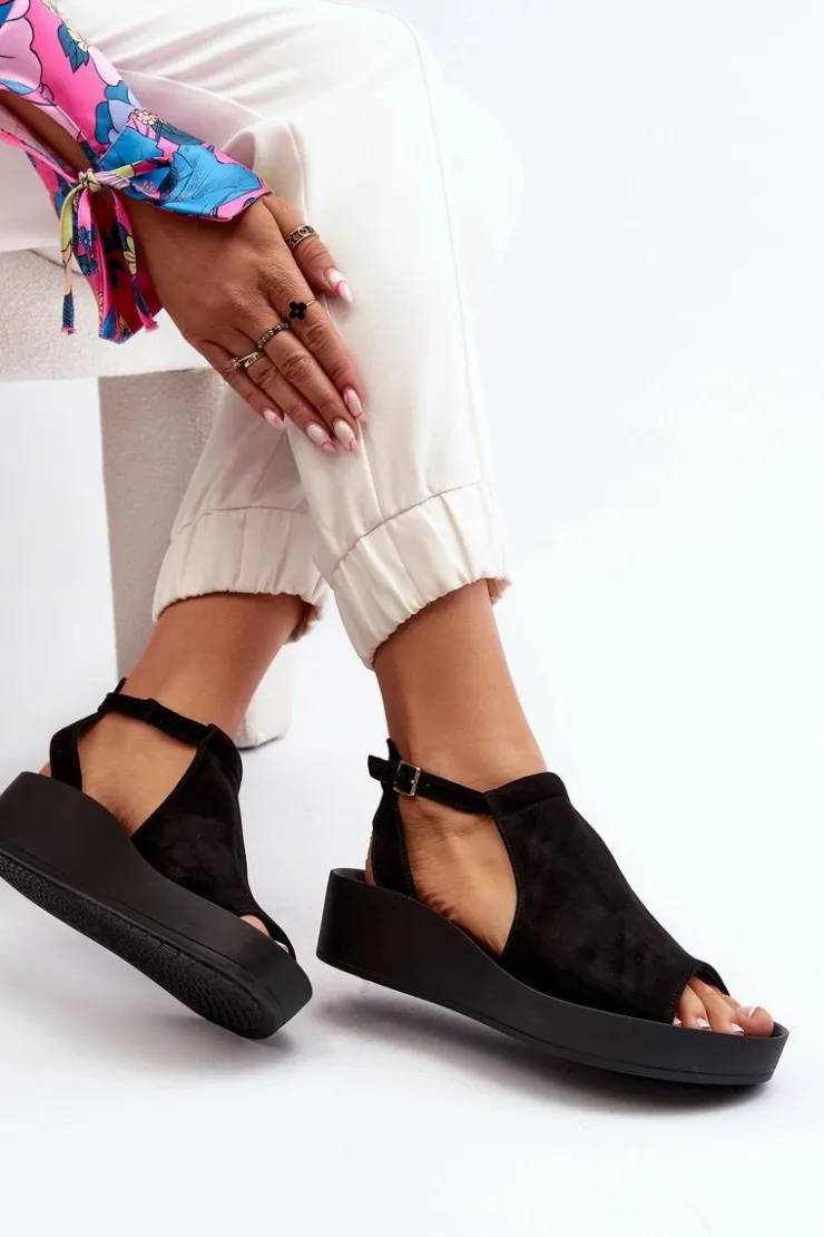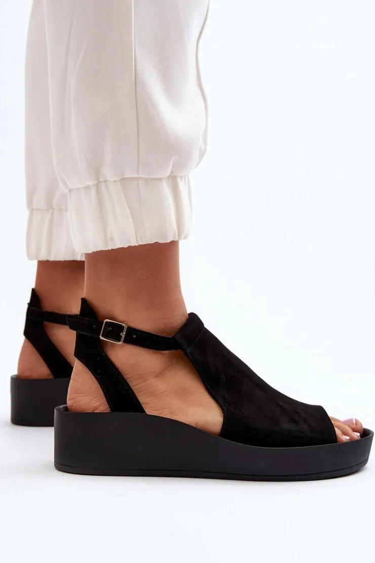 Wygodne sandały damskie to idealny wybór na letnie dni! Wykonane z naturalnego zamszu. Osadzone na platformie oraz delikatnym koturnie. Zapinane na regulowany pasek ze sprzączką. Miękka wkładka ze skóry naturalnej zapewni komfort podczas użytkowania obuwia. Idealne do każdej letniej stylizacji! Przy wyborze rozmiaru prosimy kierować się tabelą rozmiarów.