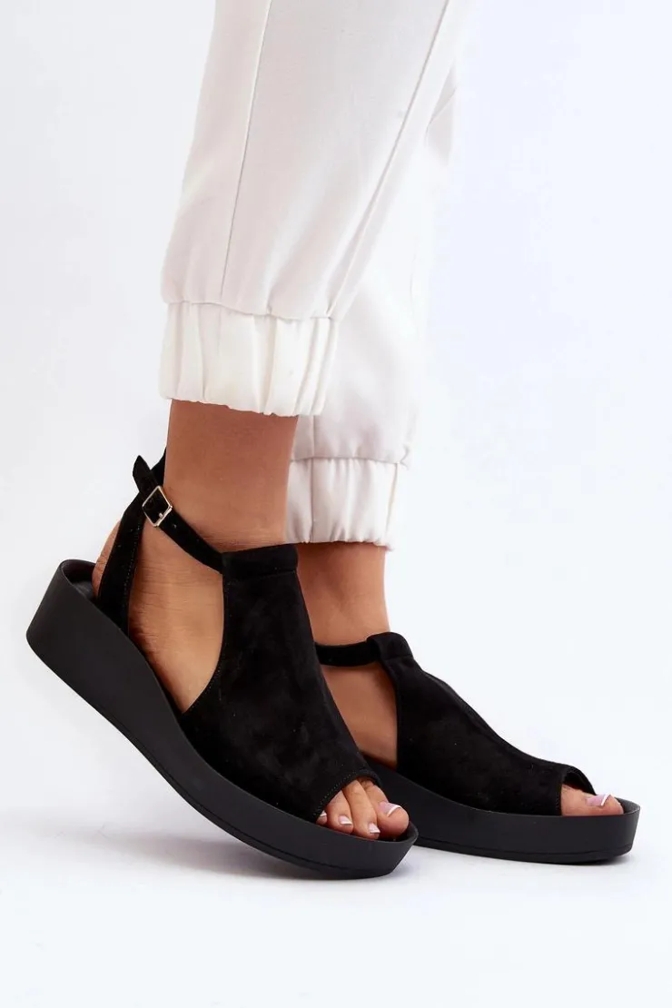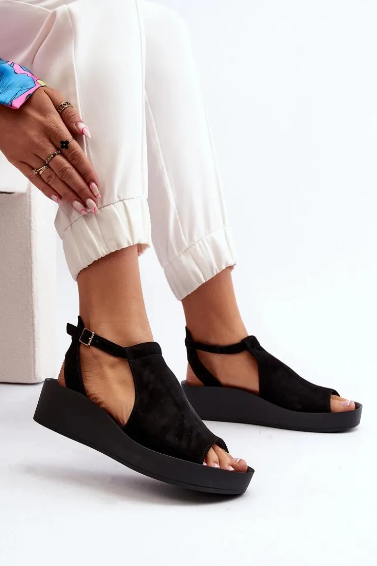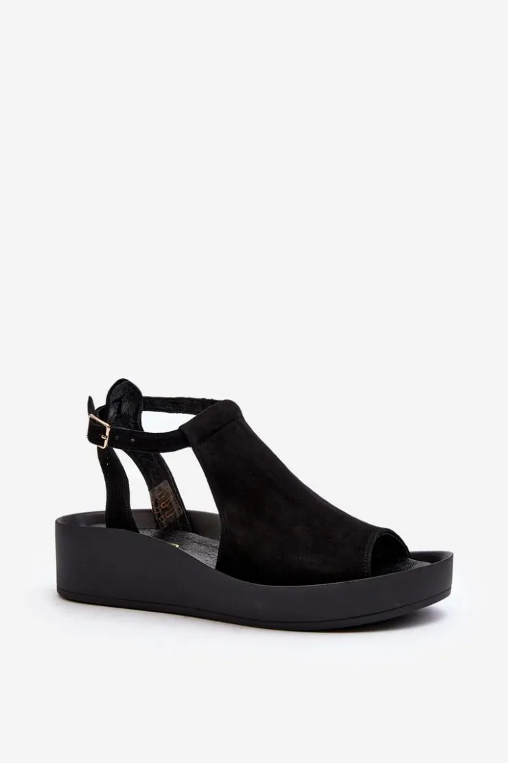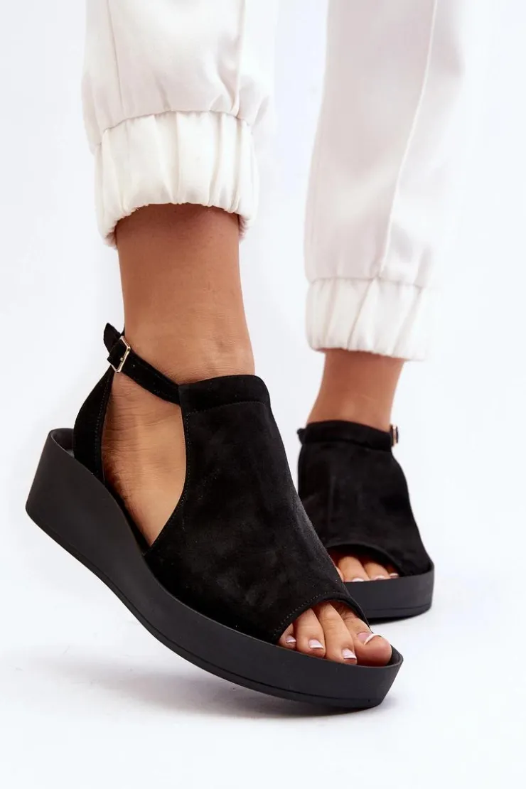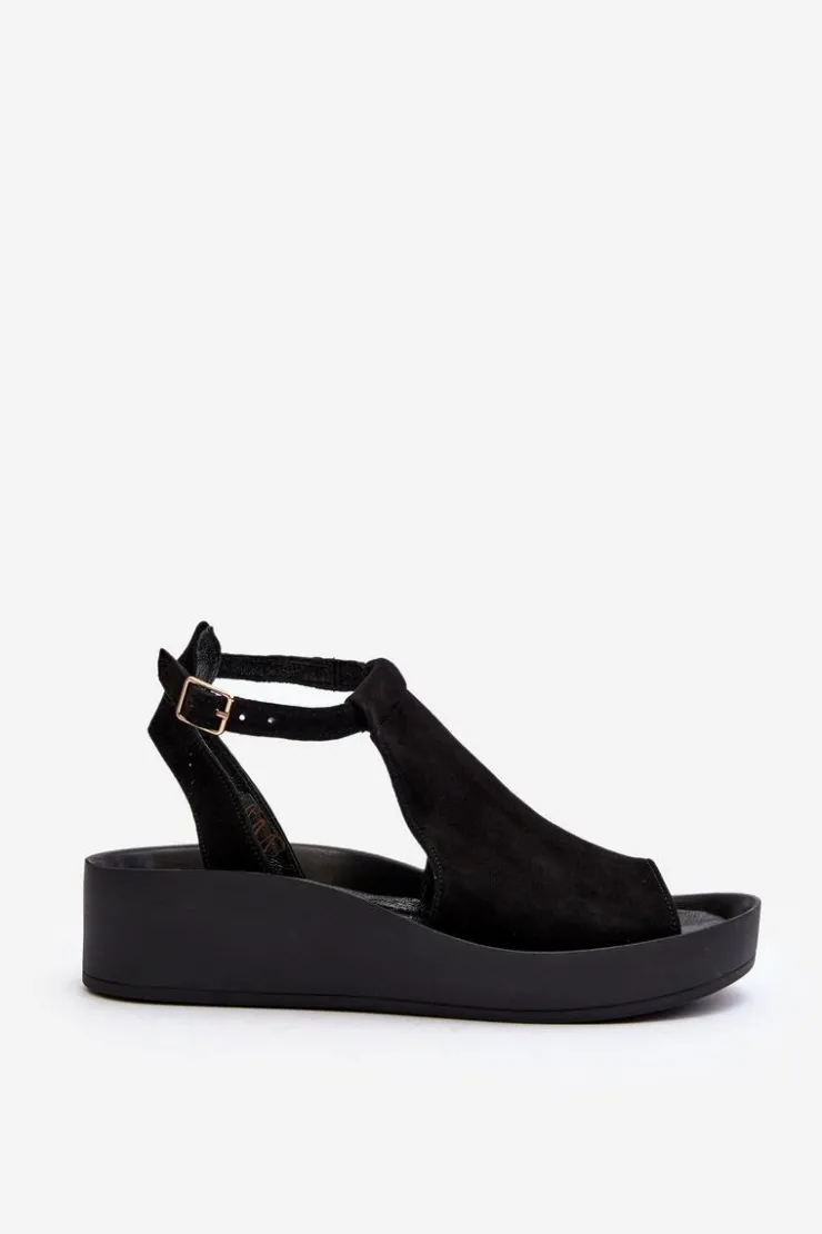 Wygodne sandały damskie to idealny wybór na letnie dni! Wykonane z naturalnego zamszu. Osadzone na platformie oraz delikatnym koturnie. Zapinane na regulowany pasek ze sprzączką. Miękka wkładka ze skóry naturalnej zapewni komfort podczas użytkowania obuwia. Idealne do każdej letniej stylizacji! Przy wyborze rozmiaru prosimy kierować się tabelą rozmiarów.