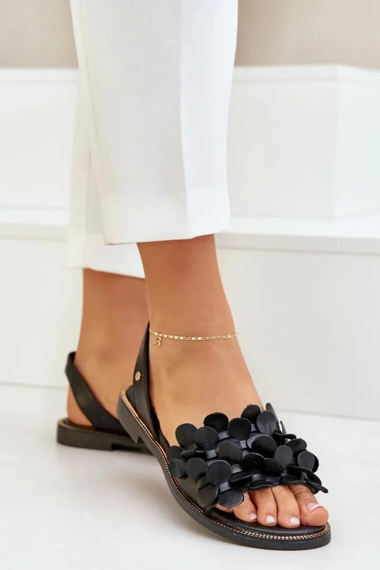 Sandały wykonane z naturalnej skóry to elegancka i wygodna propozycja na ciepłe dni. Osadzone na płaskim obcasie, zapewniają komfort i stabilność przez cały dzień. Z tyłu paseczek na piętę z gumką w środku gwarantuje idealne dopasowanie i wygodę noszenia, umożliwiając swobodny ruch. Te sandały to doskonały wybór na upale dni! Przy wyborze rozmiaru prosimy kierować się tabelą rozmiarów.