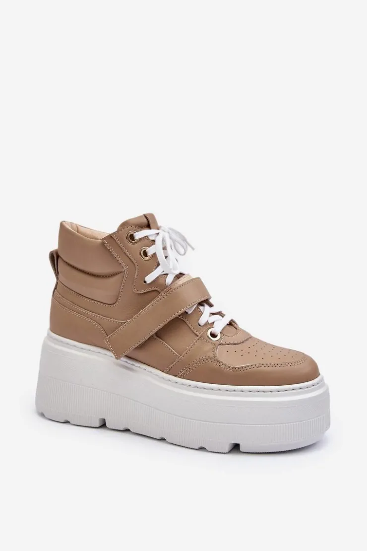 Damskie sneakersy wykonane z wysokiej jakości skóry naturalnej. Sznurowanie wzbogacone o dodatkowe zapięcie na rzep, gwarantuje doskonałe dopasowanie do stopy, zapewniając stabilność podczas chodzenia. Platforma nie tylko dodaje charakteru całej stylizacji, ale także zapewnia stabilność i komfort podczas chodzenia. Idealne zarówno na spacer po mieście, jak i na wieczorne wyjście ze znajomymi, te sneakersy są niezastąpionym elementem w garderobie każdej modnej kobiety.